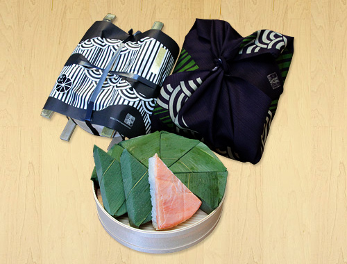 今では貴重となった天然桜鱒を、その独特の風味と旨さを幾重にも年の重みを重ねた理と技術にて調理 しました。千鳥酢、特別栽培米のコシヒカリ、熊笹、天然杉の曲げ物にて、更に風味アップ! 更に銘々包みにて、先様への心配を応援します。